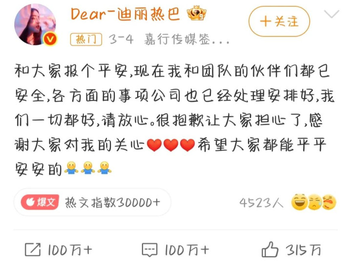 是以,其时民众齐很记忆迪丽热巴的安全,自后诚然她本东说念主也在社媒上报了祥瑞,但那件事还是在热搜上挂了好几天,可谓是闹得沸沸扬扬!