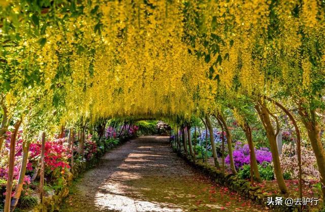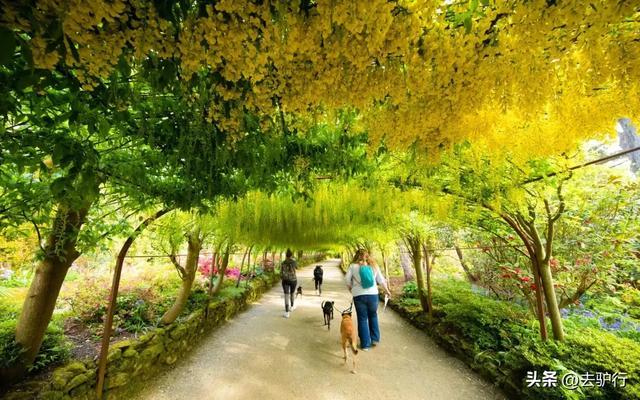 每年五月下旬到六月初,花坛进口处那条55米长的金链花拱廊会准时迎来它的三周盛花期。这期间概况有五万东谈主专程赶来,只为从那条由下垂的黄花组成的纯正里走上一回。