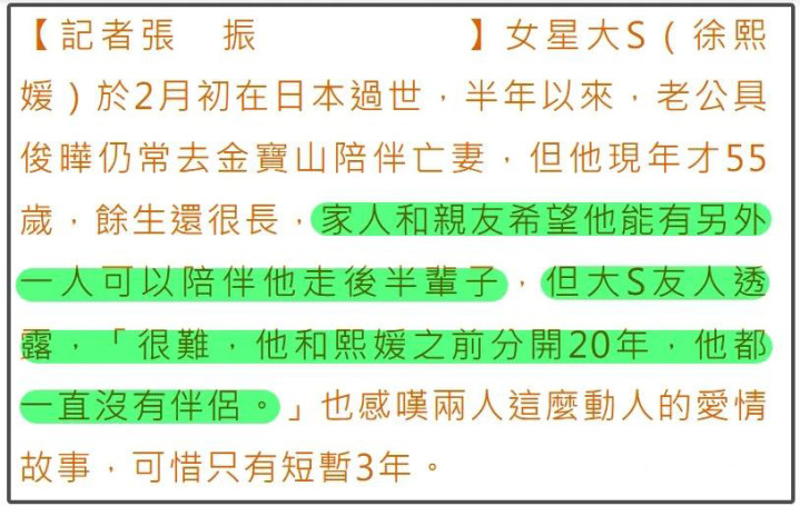 由此可见,具俊晔实乃是一个大辩若讷之东说念主,但他如故千虑一失,裸露了马脚。大概,在大S死字之后,具俊晔便也曾不才“深情”这一步棋了。另外,台媒和大S友东说念主还顺便在七夕泄露具俊晔余生很难再爱了。