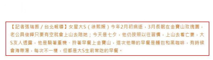 台媒还夸赞具俊晔去访问大S的时候,每一次带的食品齐不不异,但齐是大S生前最爱吃的早餐。音在弦外,就是在变特殊赞具俊晔深情,对一火妻依然是“不离不弃”。