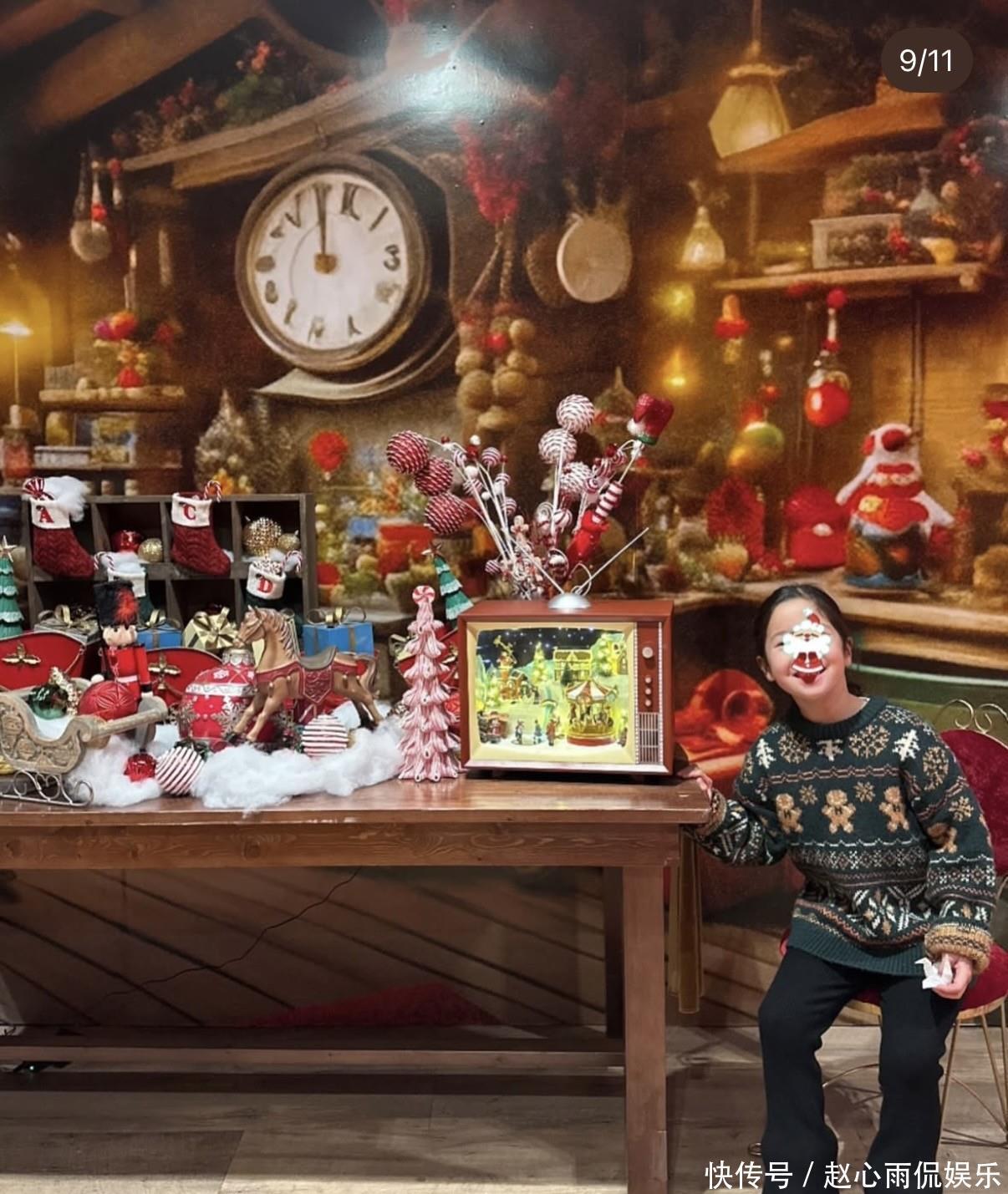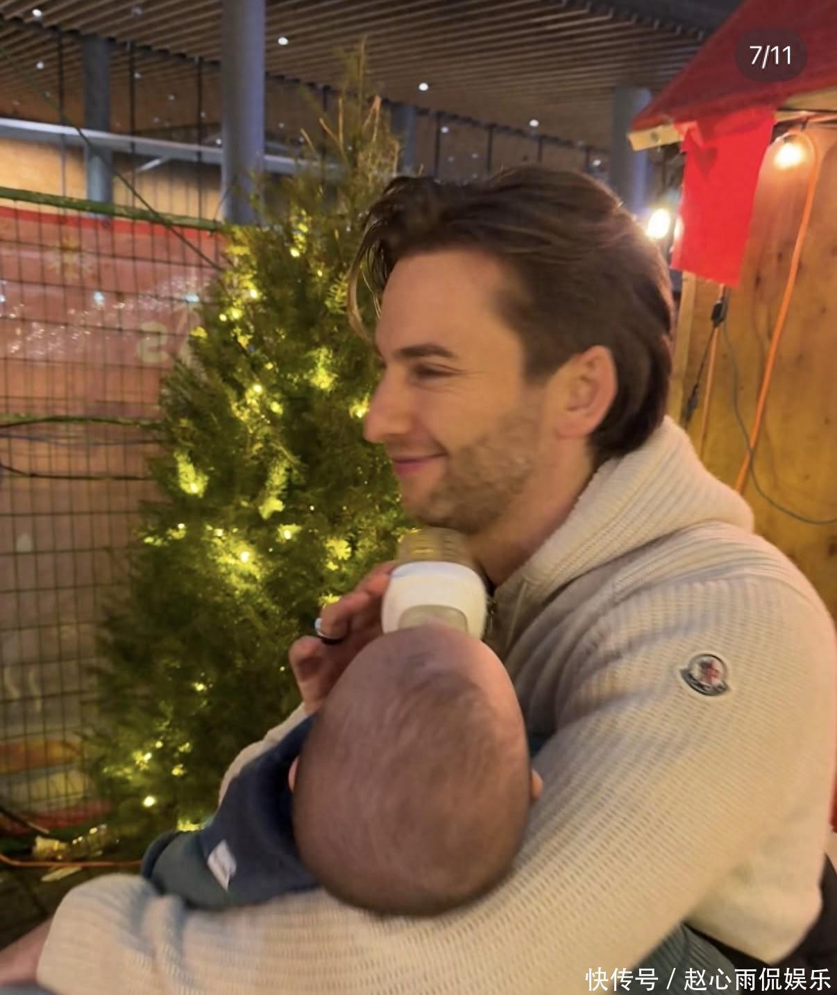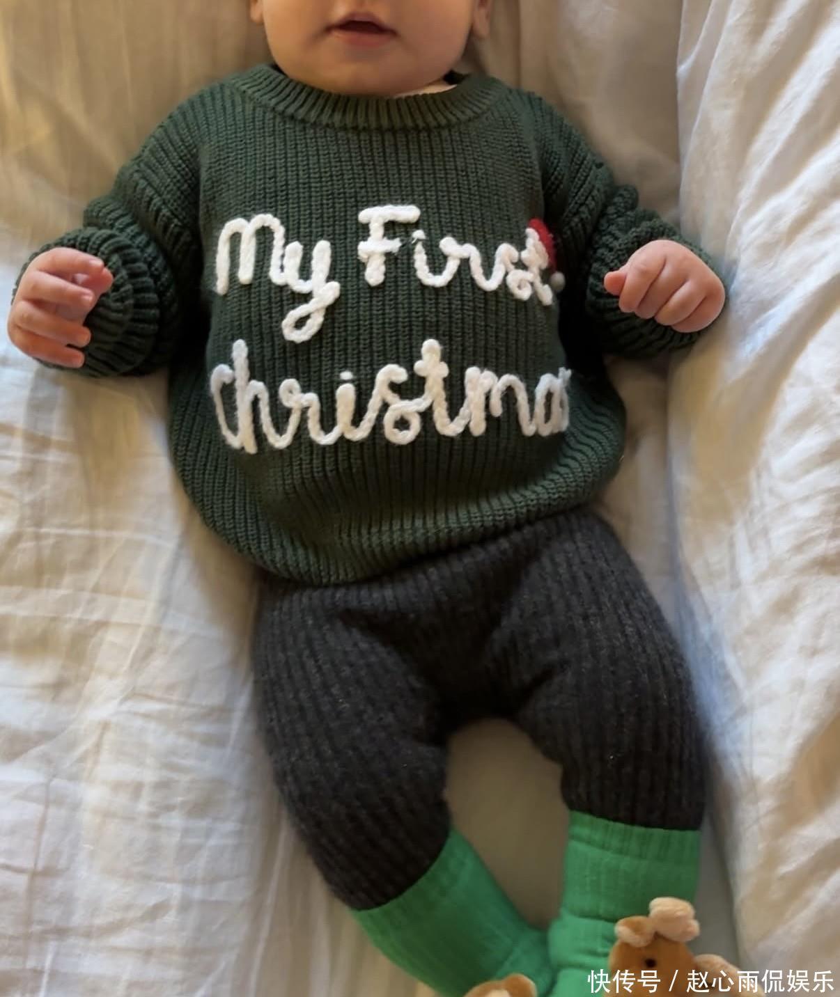 Sara 穿乌绿色雪花小熊毛衣,应景又可人;男儿则是定制款绿色毛衣,印着 “My First Christmas” 字样,搭配麋鹿袜子,萌化网友。