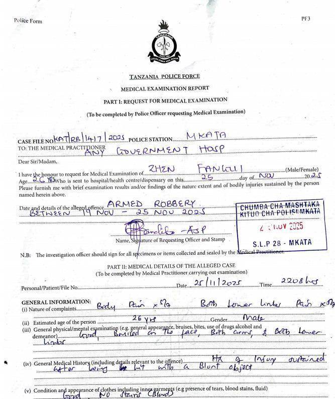 丁先生之前告诉媒体记者:“这件事性质极度恶劣,咱们如故在国内和当地齐报警了,也如故和使馆等部门调换,以确保嫌疑东谈主赵某洋不会逃出坦桑尼亚。”丁先生提供的一份当地警方出具的报警记录中纪录,罪犯确定为“武装剥夺(Armed Robbery)”,并纪录了曾先生体魄多处疾苦、面部及体魄多处淤青伤疤等,并纪录着这些伤是被钝器击伤。
