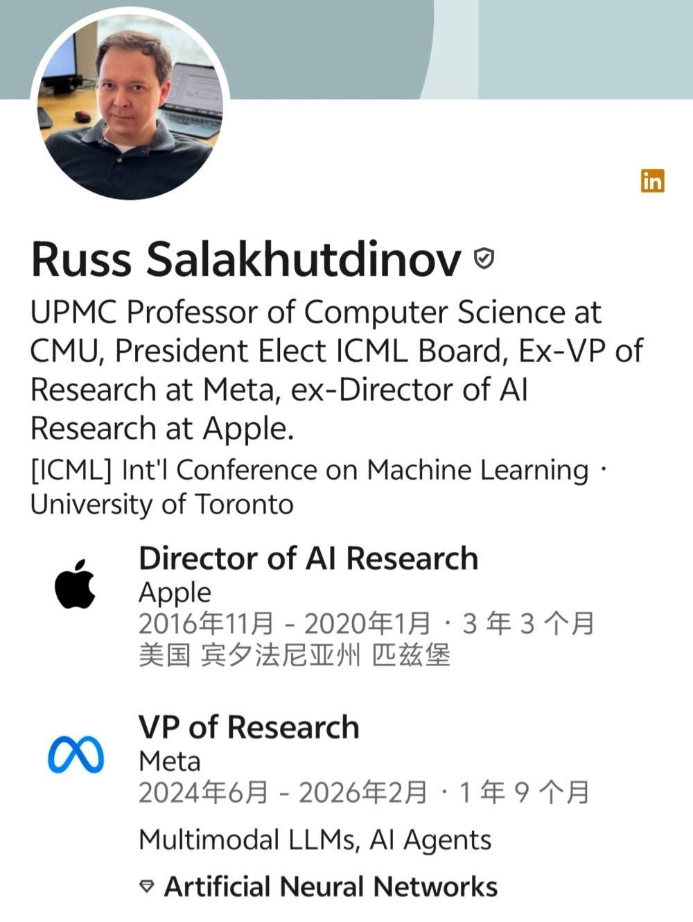 此外,Meta生成式AI究诘副总裁Russ Salakhutdinov也已辞职。在加入Meta前,他曾担任苹果AI究诘总监。
